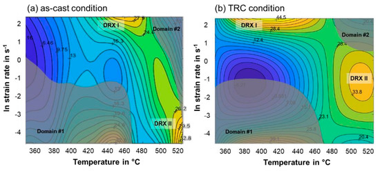 - Optimum deformation conditions are temperatures from 500 °C to 520 °C and strain rates ranging from 0.01 s−1 to 0.1 s−1 for the as-cast material as well as a strain rate of 1 s−1 for the TRC material.