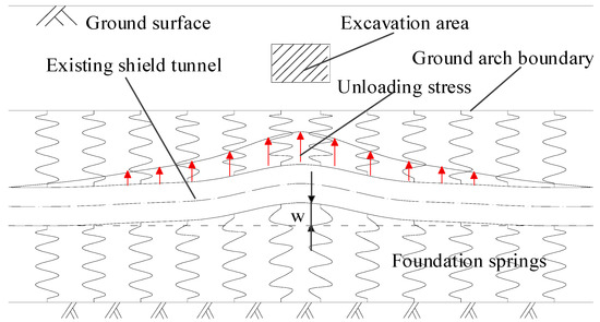 The preceding paragraphs show that if the shield tunnel is shallow, the upper strata do not provide foundation reaction forces. Then, the subgrade modulus coefficient is zero, and Equation (6) is consistent with the deflection differential equation of the single-sided elastic foundation beam model [10,11,12]. For the deep shield tunnel, two cases must be considered: (1) the excavated soil is above the ground arch. The forces on the shield tunnel conform to the double-sided Winkler foundation beam model, and the upward deformation of the existing tunnel can be calculated according to Equation (6). (2) The excavated soil is located in the ground arch height region. The shield tunnel is subjected to two-sided foundation reaction forces outside the excavated boundary and only single-sided foundation reaction forces within the excavated width. By introducing function with only two dependent variables 0 and 1, an equation that satisfies the partial missing two-sided elastic foundation beam model is established.