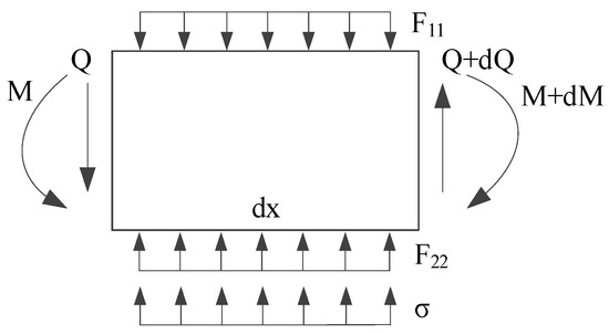 The force diagram of the double-sided elastic foundation beam model of a deep shield tunnel is established in this study, as shown in Figure 3. First, the following assumptions are made: (1) the shield tunnel is in close contact with the surrounding soil, and there is no slip between them; (2) the stratum is a homogeneous isotropic elastomer; and (3) the foundation reaction forces satisfy the requirement of a linear elastic change in the deformation range of the shield tunnel. By dividing the shield tunnel into various tiny cells along the longitudinal direction, the forces of the tunnel microunit are shown in Figure 4. In the figures, and are the foundation reaction forces before the existing tunnel deformation; and are the foundation reaction forces after the existing tunnel deformation; and are the subgrade modulus coefficients of strata above and below the tunnel; is the vertical unloading stress on the existing shield tunnel; is the vertical deformation of the existing shield tunnel; is the bending moment; and is the shear force. If the excavated soil is under the ground arch, the foundation reaction force is zero within the excavated boundary.