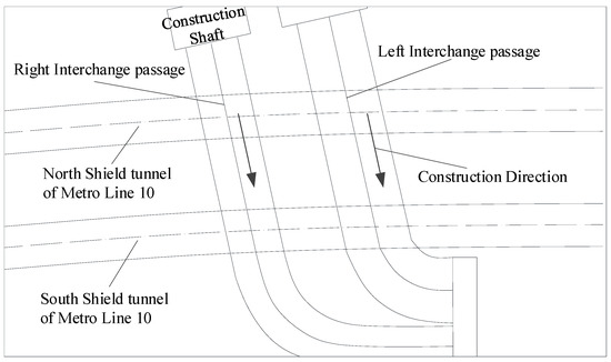 The underground interchange passages are set between the new Caoqiao station of Beijing Daxing International Airport Express and the existing Metro Line 10. The relative positions of the new passages and existing shield tunnels are shown in Figure 6. The interchange passages consist of two tunnels: the left line and the right line, which cross above the existing Metro Line 10 twin tunnels at an axial angle of 78°. During the above-crossing tunnelling, the left interchange passage will be first excavated until it crosses Metro Line 10; then, the construction of the right passage begins.
