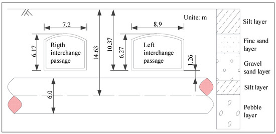 Figure 7 shows the section form of the interchange passages and the stratum condition. Both interchange passages adopt the section form of the micro-arch and straight wall. The section of the left line is 8.9 m wide and 6.27 m high; the section of right line is 7.2 m wide and 6.17 m high; the buried depths of the bottom plate of both passages are 10.37 m. The existing shield tunnels have a circular cross-section with an outer diameter of 6.0 m, an inner diameter of 5.4 m and an axis depth of 14.63 m. The interchange passages are mainly located in the fine sand layer and gravel sand layer, which are moderately compressible and have a low water content. The existing Metro Line 10 is mainly in the pebble layer, which has high strength and low compressibility. The burial depth of the underground water level is 25 m, which is not considered in this paper.