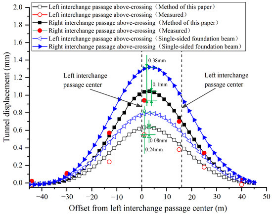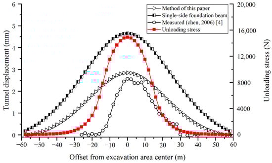 Figure 9 shows the comparison between the model calculation and the actual measurement. It can be found that the measured maximum tunnel displacement is 2.57 mm. The calculated maximum upheaval by the proposed model is 2.85 mm, which is 11% larger than the measured value. The calculated maximum upheaval by the single-side foundation beam model is 4.65 mm, which is 81% larger than the measured value. The proposed model predicts a smaller and closer deformation than the traditional model. The maximum tunnel displacement obtained by the method in this paper is basically consistent with the measured value. However, regardless of whether the method in this paper or the traditional method is used, the longitudinal influence range of the calculation is larger than the actual measurement, which is similar to the calculation conclusions of the literature [12,13]. The reason is that the elastic foundation beam models simplify the shield tunnel as a continuous beam for calculation, whose displacement changes are continuous. In reality, shield tunnel segment staggering will occur during the above-crossing construction, which weakens the deformation transfer. Therefore, the fluctuation of the measured displacement curve is similar to the computational unloading stress curve. Nonetheless, the maximum displacement is generally the most important prediction value in engineering practice, and the proposed model provides a more accurate prediction for deep shield tunnels.