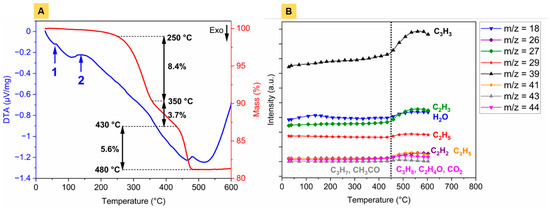 Figure 2 highlights the features of thermal binder burnout. The DTA signal and the thermogravimetric curve (Figure 2A) demonstrated a slight mass loss (~1 wt.%) before 250 °C on account of the gradual evaporation of low-molecular-weight oligomers—most probably from residual paraffin wax and stearic acid—and adsorbed water molecules.