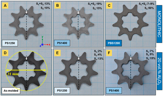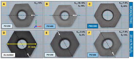 Sintered sprockets: (A) PS1250, (B) PS1400 and (C) PBS1200 of monolithic samples and (D) as-molded reference, (E) PS1250 and (F) PS1400 of N720 aluminosilicate fiber-reinforced (20 vol.%) composites. White arrows and dashed lines indicate the location of the gate and the axis parallel to the injection channel, respectively. Sintering shrinkage in each direction is given by the S values.