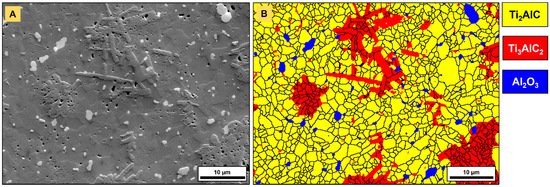 Figure 6 highlights the outcomes of the EBSD analysis performed on a monolithic PBS specimen. The height offset of Ti3AlC2 grains, organized in clusters, as well as the presence of submicrometric pores concentrated in these specific areas, were observed (Figure 6A), as already evidenced in a previous study [24]. The presence of cavities, essentially located in and nearby to Ti3AlC2 grains, might either arise from a minor loss of Al and the interconversion of Ti2AlC to Ti3AlC2 [40] or from the etching of potential minor impurities (titanium aluminides) during metallographic preparation. As mentioned in a previous work [24], a major advantage of FAST/SPS is the inhibition of grain growth (Figure 6B) and the preservation of a fine-grained microstructure, as well as a limited alteration of phase composition. The alumina grains found at Ti2AlC grain boundaries mostly arise during the synthesis and sintering procedures [24,43] on account of a low oxygen content in raw materials or non-negligible oxygen partial pressure in furnace chambers. The average grain size yielded 1.28 µm (±0.64 µm), 0.98 µm (±0.55 µm) and 0.77 µm (±0.43 µm) for Ti2AlC, Ti3AlC2 and Al2O3, respectively. The phase map highlighted the broad particle size distributions for all three detected phases. In addition, the morphology of Ti3AlC2 grains was more plate-like than the Ti2AlC and Al2O3 grains. This was also found in the average aspect ratio, yielding 1.69 (±0.49), 1.96 (±0.79) and 1.51 (±0.38) for Ti2AlC, Ti3AlC2 and Al2O3, respectively.