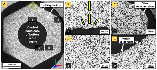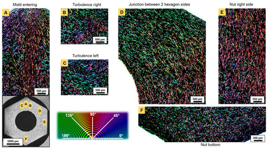 As a result of the compression between the downwards entering mass flow and the opposite upwards stream, the FOD were quasi-monomodal (Figure 9B,C). This indicates that most of the fibers were oriented perpendicular to the entering flow. In segments parallel to the injection channel (Figure 8E) and in all four of the other sides of the hexagonal nut (Figure 8D), the dominant orientations were ±90° and −45°, respectively (Figure 9E,D), indicating the good alignment of fibers with the flow. At corners (area (ii) in Figure 7A,C), fibers were essentially oriented in the z-direction, where their quasi-circular cross-section was visible. In the central ring (area (iii) in Figure 7A,D), the orientation pattern was more random, while in nearby mold walls (area (iv) in Figure 7A,E and Figure 8E), the fibers were aligned in the (x,y) plane along the edges.