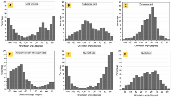 Fiber orientation distribution (FOD) in a 20 vol.% fiber-reinforced Ti2AlC hexagonal nut for corresponding areas in Figure 8: (A) at the mold entering, (B) in the right turbulence, (C) in the left turbulence, (D) at the junction between two hexagon sides, (E) in the right side of the nut and (F) in the bottom of the nut.