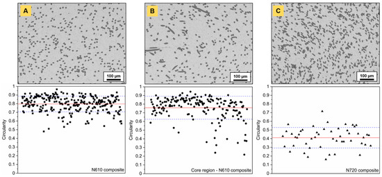 Circularity of fiber cross-sections determined for: (A) 10 vol.% N610 fiber-reinforced, (B) 10 vol.% N610 fiber-reinforced (core region) and (C) 20 vol.% N720 fiber-reinforced Ti2AlC composites.