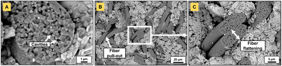 Fracture surface of a Ti2AlC nut reinforced with 20 vol.% N720 fibers: (A) submicrometric pores arising from mullite decomposition, (B) partial fiber pullout observed at (C) higher magnification with fiber flattening.