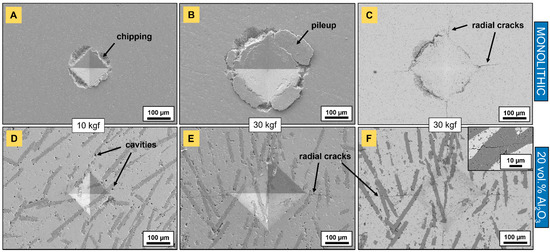Vickers indentations on powder-bed-sintered monolithic and aluminosilicate fiber-reinforced (20 vol.%) Ti2AlC composites. (A–E) are SE images, and (C,F) are BSE images.