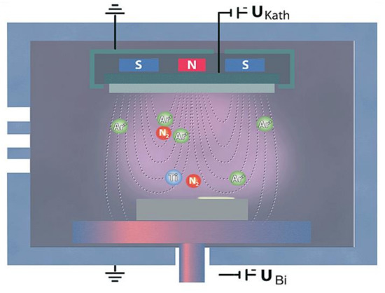 The principle of HIPIMS PVD sputtering is shown in Figure 2; the applied substance is the cathode (target) of the magnetron discharge. The discharge burns in a very dilute inert gas (usually Ar) in a vacuum chamber. Above a negatively charged target (500 to 1000 V), argon plasma is maintained, the positive ions of which are accelerated by the electric field to the target and, upon impact, sputter it. In front of the target, a magnetic field with a defined shape is created using an electromagnet or permanent magnets [15]. In this case, electrons that escape from the space in front of the target during classical sputtering must move along the helix, along the lines of force due to the Lorentz force [16,17]. Thus, their path in the vicinity of the target is significantly lengthened, the duration of their stay in the discharge region is also extended, and the probability of ionization of other atoms of the working gas increases. This makes it possible to maintain a discharge at a lower pressure (on the order of a tenth of a Pa) and at a lower voltage (on the order of a hundred volts). In particular, the lower pressure is positively reflected in the greater purity of the formed layers [18].