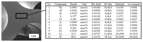 Powerful milling drills, made of high-quality high-speed steel (HSS), which is ennobled with legures-tungsten, molybdenum, and chromium, are widely used in the automotive, aerospace, and military industries. Spring steel used in the production of industrial cobalt milling drills resists bending of the milling drill when drilling into a hard metal. The combination of tungsten and cobalt, together with the optimized geometry of the tip of the milling drill, keeps the working edges of the milling drill sharp four times longer. The prepared samples were examined using XRF analyses, where the area of the examined sample, including the result of the chemical composition, is shown in Figure 4. This analysis led to the exact composition of the body of the core of the milling drill before its subsequent coating. From the results of the XRF analyses, it is evident that tungsten with an 88.6% content is the constituent material of the milling drill and there is also about 10.3% cobalt serving as the bonding material.