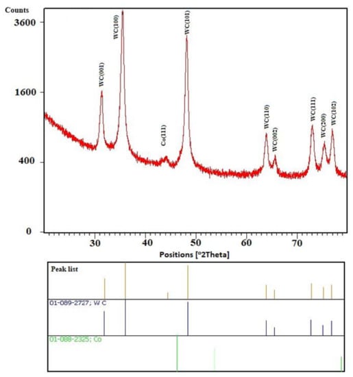 XRD phase analysis was performed to determine the phase composition of the tool. Figure 5 shows the obtained X-ray diffractograms with the diffraction peaks that were determined using a conventional θ-2θ X-ray diffraction scan of the studied tool. The diffractogram shows that the core of the milling drill is composed of WC. The spades belonging to the WC are wider, with a clearly larger FWHM (full width at half maximum) being the difference between the two values of the independent variable at which the dependent variable is equal to half of its maximum value. That is, the particles of the WC are fine-grained. Widespread at all peaks, WC (001), (100), (101), (110), (002), (111), (200), and (102) were approximately the same, so they were probably regular crystallites. Another peak at Co (111), in the diffractogram, opposite to the content of the WC, indicates the presence of another phase. It is noticeable that this is a cubic alpha phase, which confirms the content of Co as a binder. Thus, the quantification of the elemental composition in the conclusion is supported only by the chemical composition and not by the phase analysis.