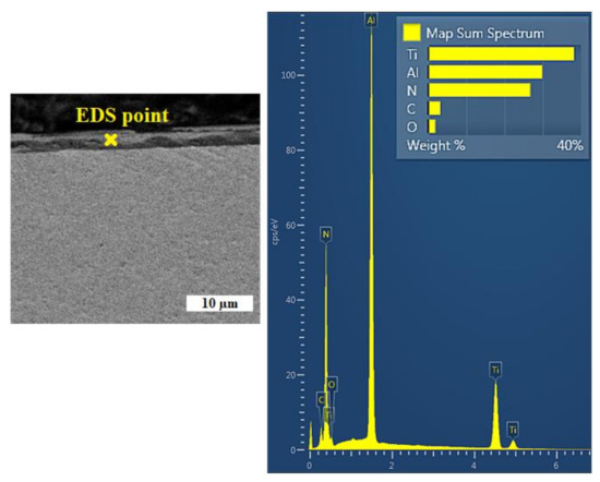 Among the current most-often created abrasion-resistant coatings can be found layers based on TiAlN. This layer was developed with the need to increase the oxidation resistance of tin layers. TiAlN layers compared to TiN, not only have higher oxidation resistance, but also a higher hardness of about 2000 HV, which allows the use of these coatings in intensive cutting conditions, such as high-speed machining and dry machining [21]. Point EDS analysis of the selected location (Figure 6) shows a composite TiAlN coating with the following percentage of elements: Ti-38.5%, Al-30.3%, N-27.3%, C-2.5%, O-1.5%. The analysis showed that the composite TiAlN coating contained titanium, aluminum and nitrogen. We performed a standard point analysis, followed by acquiring data from the elemental maps. Thus, the presented spectrum was acquired from multiple points on the sample, and is presented as a “combined” EDS spectrum, representing the average surface chemistry of the sample’s surface. The abundance of carbon in the elemental composition of the analyzed samples can be explained by the diffusion of this element from the substrate. Oxygen occurs in an air atmosphere and it is probably that during sputtering, oxygen atoms were entrained and their integration into the coating layer occurred. The ratio of titanium to aluminum can be adjusted by the aluminum content in the target [22]. In addition, carbon (2.5%) and oxygen (1.5%) were present in the coating in a small amount as polluting elements originating from the used technology, which Wagner also indicated in his study [23].