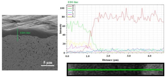 The average thickness of the PVD coatings, as determined by SEM, was 1.5–1.7 µm (Figure 9). TiAlN coatings were characterized by a fine-grained microstructure with a low porosity, small internal stresses, excellent adhesion and a good thermal stability [25]. However, looking at the morphology of the micro-coating in detail, the compactness of this layer is observed to have a small number of pores. Moreover, in this area, with the help of linear EDS analysis, it can be seen that no expansion joint was found between the layer and the base substrate. Figure 9 also shows good adhesion between the layer and the base material. In the examined area of the layer (1–3 µm), a gradual decrease of Al is evident. This phenomenon was caused by the process of magnetron sputtering, in which Al was diffused into the base material [26]. A similar phenomenon can also be seen with nitrogen and very slightly with Ti (due to the fact that the differential potential of Ti compared to Al is much smaller [27]). During the magnetron sputtering process, W particles were also bombarded into the coating (at the bottom of the coating). This indicates a very good interconnection of the coating and the base material.