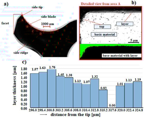 Display of the measured length of the coated TiAlN layer of the tool (a) showing the place of the coated layer (b) of the tool where the coating is almost completely absent (c).