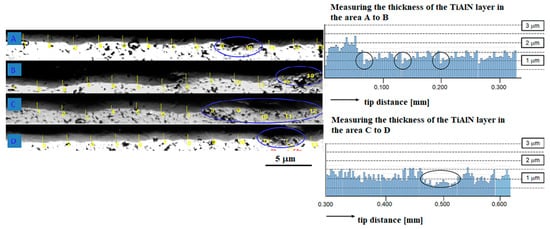 The measured thickness of the TiAlN layers range from 0.57 µm to max. 1.76 µm (Figure 11b), but, for example, about 0.3 and 0.5 µm from the tip, there are places that are practically without a layer (Figure 11c). From the overall visualization of the measured section of 6.4 mm, four places (marked with the letters A, B, C, D) are visible where the layer thickness is practically zero (marked with a circle in Figure 12). Therefore, it will be necessary to change the position of the milling drill a bit more when coating, so that even shielded areas are covered and a more even coating is achieved. Another method that could allow a uniform distribution of the coating is the combination of the TiAlN/TiAlCN coating mentioned by Tillmann [29] and Xiang [30].