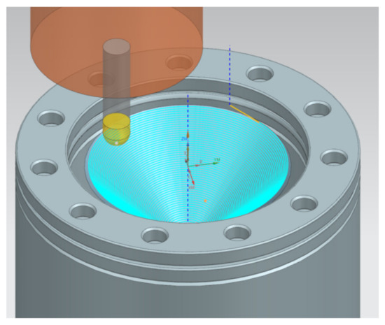 The tool indents into the workpiece by step size and follows a spiral path for the desired part. The tool trajectory (Figure 3) was generated using NX CAM version 1938 software (Siemens, Munich, Germany) based on the numerical model of the desired shape of the drawpiece exported to the machining software.