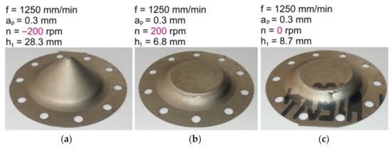 It was found that the direction of spindle rotation (Figure 5) significantly affects the formability of the Grade 2 titanium sheets, but only at a high speed of rotation of the spindle and at what is, concurrently, a small size of incremental step. Drawpieces formed with an incremental step size of 0.3 mm, maximum feed rate of 1250 mm/min, and spindle rate of −200 rpm (clockwise direction), were successfully formed (Figure 6a). However, drawpieces formed at 200 rpm (anticlockwise direction) and the same values of incremental step size and feed rate cracked at a height of 6.8 mm (Figure 6a). This is due to the fact that at 200 rpm the tool with the anticlockwise direction of rotation rolled on the surface of the sheet. As such, heating of the sheet was limited and the sheet metal cracked prematurely.