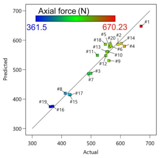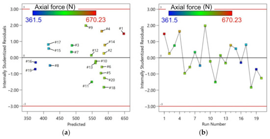 Figure 7 presents a plot for the axial force with predicted versus experimental values. The actual values were relatively close to the predicted straight line of regression. The proportional distribution of data around this line proves a good correlation between the predicted and experimental values. The residuals generally fall on a straight horizontal line (Figure 8), implying that the model errors are distributed normally [51]. The diagnostic analysis is supplemented by the normal probability plot of residuals also arranged along the straight line (Figure 8b).