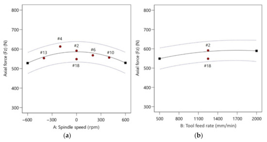 In order to analyse the effects of the input control factors on the in-plane force, a model of the response was developed. The effects of spindle speed, tool feed, and step size were analysed based on different plots. The adequacy of the response surface methodology models that were built was checked through ANOVA and the coefficient of determination R2. The equation, which is consistent with the experimental model and describes axial force (Fz), is given in Equation (2) with the coded factors: