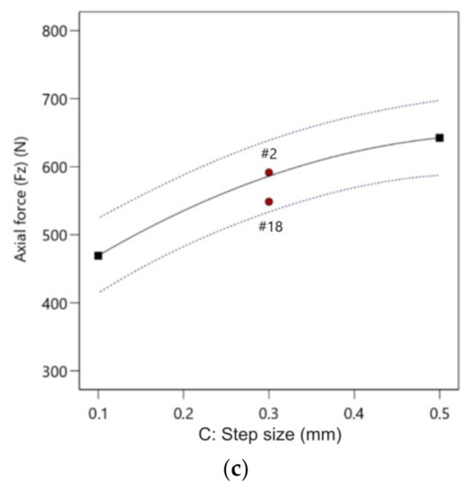 One-factor plots explain the impact of individual factors and their effect on the axial force. From Figure 9, the following information can be obtained: In the range of the experiment, if spindle speed is higher, then axial force is lower, 590 N for 0 rpm and 528 N for 600 rpm—the temperature achieved by friction plays a key role in reducing the axial forming force (Figure 9a). With an increase in feed rate from 500 to 2000 mm/min there was a slight change in the axial forming force from 549 N to 589 N (Figure 9b). This indicates that feed rate has an insignificant role in the axial forming force. With an increase in step size from 0.1 mm to 0.5 mm, the axial force increased from 469 N to 642 N, indicating that step size is a major factor affecting the axial forming force (Figure 9c).