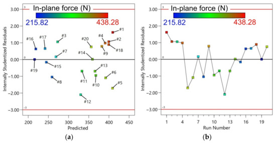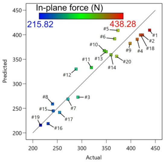Table 6 presents the ANOVA for the in-plane force at a 95% confidence interval. Model terms that were significant were C, A2, B2, and, marginally, B. The value of R2 achieved was 0.9142, which means that the model is 91.42% capable of predicting the response. The R2-value was in reasonable agreement with the adjusted R2 (0.8836) and the predicted R2 (0.8159). Therefore, the model as designed can be applied to predict the in-plane force in the selected ranges of the parameter. The F-value of 29.83 implies significance of the model. Figure 10 presents the plot of the predicted against the experimental values of the in-plane force. As illustrated in Figure 11, the regression model tends to have error randomness without too many outliers, and a normal distribution in terms of residuals. The equation with a coded factor that fits the experimental model is given in Equation (4):