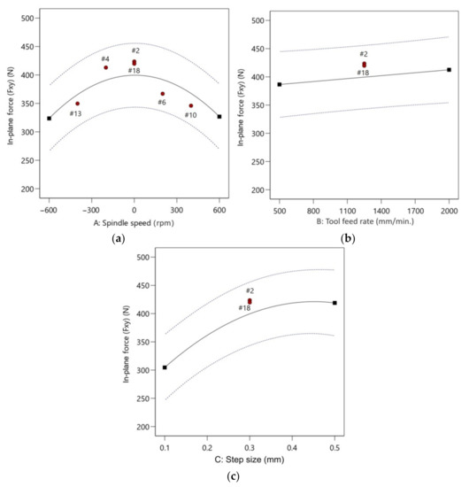 The analysis of one-factor plots explains the impact of individual factors on the radial forming force. In the range of the experiment, higher spindle speed produces a lower in-plane force, 400 N for 0 rpm and 324 N for 600 rpm, which means that the temperature produced by friction is a significant factor in the reduction of the in-plane force (Figure 12a). With an increase in the feed rate from 500 to 2000 mm/min, there is a slight change in the in-plane force from 387 N to 413 N (Figure 12b). This indicates that the feed rate does not play a key role in the in-plane force. Similar observations were found by Özgen et al. [52]. As the step size increases from 0.1 mm to 0.5 mm, the in-plane force changes from 305 N to 421 N. This indicates that the step size is a major parameter affecting the in-plane force (Figure 12c).