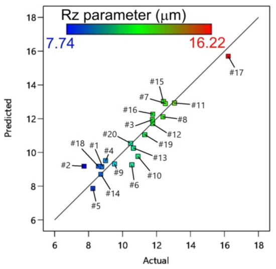 Figure 13 shows a strong correlation between the actual and predicted values of the surface roughness parameter Rz. The distribution of the residuals is shown using a plot between the predicted and residual responses (Figure 14). The points between boundary lines show no definite structure [58,59].