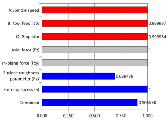 The ramp plot in Figure 17 shows the desirability for each factor in each response, as well as the combined desirability. The higher up the ramp, the better the desirability [63]. Output responses such as the surface roughness parameter Rz and the forming success are taken into account. The best combination of solutions is Rz = 10.370 µm and h = 100%, which can be achieved when forming with a spindle speed of 580 rpm, feed rate 2000 mm/min, and step size 0.5 mm (Figure 17). The predicted axial forming force and in-plane force at the optimal forming parameters are Fz = 591.52 N and Fxy = 361.06 N, respectively. The desirability for the optimum parameters was 90.6% (Table 8).