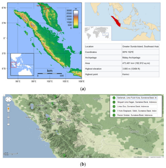 (a) Napa soil distribution in Sumatera Island. Topography of West Sumatera, (b) and map of West Sumatera province which contains the largest amount of Napa soil [9].