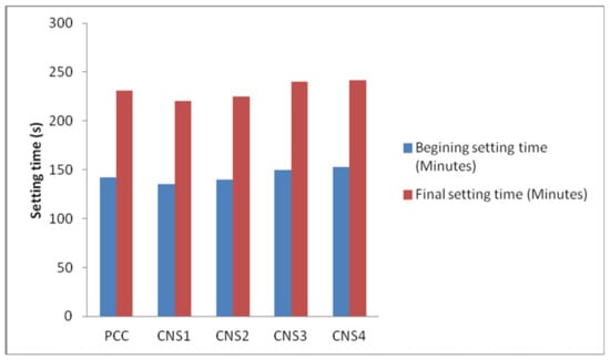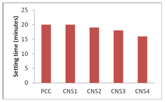 Water was added to 650 g of cement to produce paste according to normal consistency analysis. Then, the penetrating test was carried out using Vicat pins of 1 diameter every 10 min. The first setting was marked when the pin penetrated more than 25 mm and stopped when the Vicat pin could not penetrate further, which implies that it has reached the final setting.