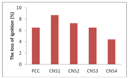 Analysis of LOI was carried out according to the loss of water and CO2 when the cement was ignited. Firstly, 1.000 g of cement was ignited at the temperature of 1000 °C for 15 min. Then, it was placed in a desiccator for the cooling process.