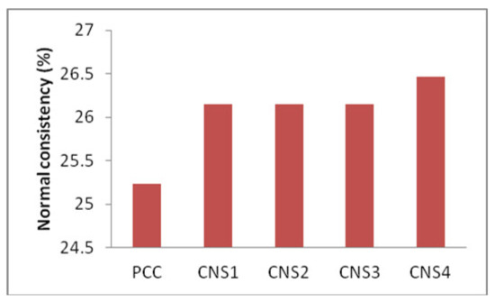 The effect of the of Napa soil usage and its normal consistency is shown in Figure 8. It shows that composite cement that contains 16% Napa soil (CNS4) has higher values of normal consistency than cement CNS1, CNS2, and CNS3, which is due to the size of the cement particles as well as low surface area that reduces the water distribution and eventually requires a greater volume of water to be of normal consistency.
