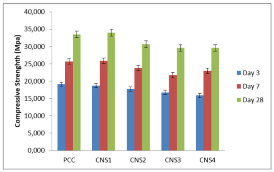 Napa soil’s effect on compressive strength is displayed in Figure 10, which shows a decrease with increasing composition of the Napa soil as the additive contributing silica–alumina. The cements CNS2 and PCC have the same composition, but the control contains pozzolan, while CNS2 contains Napa soil. Meanwhile, at days 7 and 28, the compressive strength of the mortar of the cement containing 4% Napa soil (CNS1) was higher than that of the pozzolan.