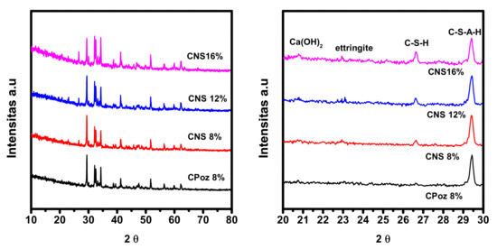 XRD analysis was performed to determine the mineral content of composite samples such as calcium silicate hydrate (C-S-H), calcium aluminosilicate hydrate (C-A-S-H), portlandite (Ca(OH)2), and ettringite minerals in the sample (Figure 11). The intensity of calcium hydroxide (Ca(OH)2) 2θ = 20.71 and ettringite 2θ = 22.9 increased with the increasing percentage in the sample. The peak of calcium silicate hydrate (at 2θ = 26.55) increased with the percentage in the sample. An increase in intensity also occurred at 2θ = 29.41, which indicates a very fast hydration process in the sample. The higher intensity of calcium hydroxide (Ca(OH)2) was able to form C-S-H and increase the strength of the sample.