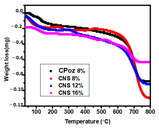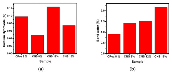 Figure 13 shows the calculated percentage of calcium hydroxide in the samples. Sample CNS12% (CNS3) contains the highest percentage of calcium hydroxide, while the water content is 1.529%. The lowest percentage of calcium hydroxide was found in sample CNS8% (CNS2), which was caused by the formation of CSH gel in the sample.
