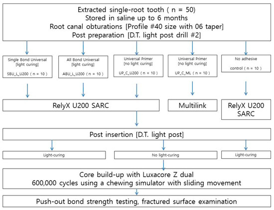 A total of 50 roots were randomly divided into 5 groups (n = 10) after the endodontic procedure with 8 one-canaled teeth and 2 two-canaled teeth in each group and stored in saline for 24 h. Next, posts were cemented to each group containing 10 roots, using 5 different post luting procedures with either RelyX U200 (3M ESPE, St. Paul, MN, USA) or Multilink (Bisco, Schaumburg, IL, USA).