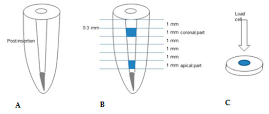 The specimens were sectioned horizontally into 1-mm-thick slices using a low-speed diamond saw (Met-Saw; R&B Co Ltd.) under water cooling, as shown in Figure 2. The coronal and apical parts of the teeth were tested to evaluate the push-out bond strength. The push-out bond strength test was performed using a universal testing machine (EZ-S; Shimadzu Scientific Instruments, Kyoto, Japan). The load was directed from the apical to coronal direction at a cross-head speed of 0.5 mm/s until bond failure occurred. The debonding force value (N) was divided by the post-dentin surface area to calculate the push-out bond strength (MPa). The total bonding area was calculated as follows: