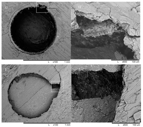 SEM images of specimens from selected groups. Cohesive, adhesive, and mixed failures of the posts can be seen. Single Bond group (SBU_L_U200) cohesive failure of posts (A,B). All-Bond group (ABU_L_U200) adhesive failure of the luting materials (C,D). Universal primer group (UP_C_U200) mixed failure of posts and luting materials (E,F). Universal primer with multilink group (UP_C_ML) adhesive failure of the luting materials (G,H). Control group (Control) adhesive failure of the luting materials (I,J).
