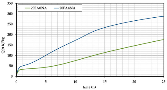 The results of the hydration heat for the analyzed pastes during the first 24 h of their curing are shown in Figure 1 and Figure 2. Figure 1 shows the heat release in time, while Figure 2 shows the total heat release during the test.