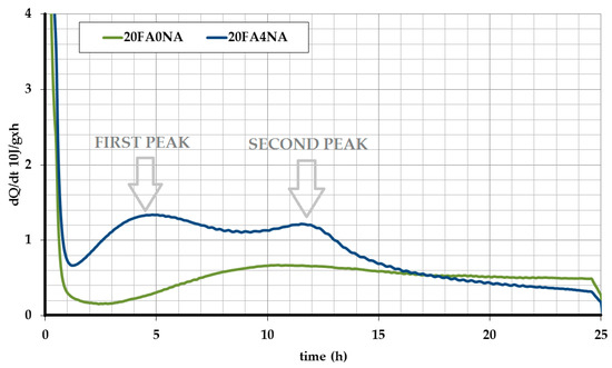 The first tests were possible only after 8 h of curing (Table 7 and Table 8). The NA series also showed a significant increase in strength compared to the reference paste. After 8 h of testing, the compressive strength was nearly 4 times higher for the NA-modified sample. In contrast, the tensile strength during this period was more than 2 times higher for the 20FA4NA. After 12 h, the NA-modified samples had almost 3 times higher fcm and still significantly higher fctm. However, during 12 consecutive hours of pastes maturation, these differences began to blur. After 24 h the influence of NA was still significant, but it was less than 2-fold. Therefore, in order to accurately diagnose the dependence and analyze the rheological processes taking place in the samples, further experiments were carried out, i.e., the hydration heat and microstructural analyses using SEM.