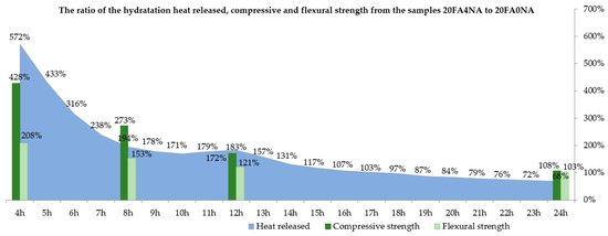 Analyzing the graphs shown in Figure 1 and Figure 2, one should notice a significant increase in the amount of hydration heat released, observed after the NA matrix modification. Figure 3 compares the values of the total amount of heat released at different time periods for both analyzed composites. This figure also shows the percentage increases in both strength parameters after the application of active NA.