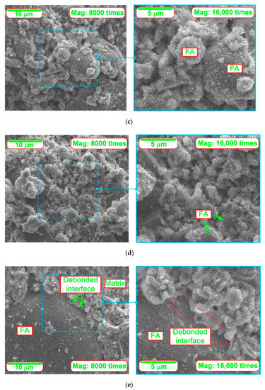 Microstructural investigations were carried out using the SEM—QUANTA FEG 250. For each of the composites the images were taken at the same magnifications, i.e., 8000 and 16,000 times and the same reference scales, i.e., 10, and 5 µm. For each type of material and each time period the images were taken on 6 samples. 30 images were taken for each sample (a total of 120 images for each paste series), from which representative images were selected. On the SEM images, the following were marked or described: areas with the FA grains, areas with clearly distinguishable phases, e.g., C-S-H, microstructure of contacts between FA and cement matrix, e.g., view of defective or dense interfaces.