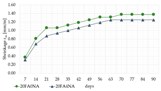 When considering rheological shrinkage studies over 90 days, it was also observed that the NA application significantly reduces the relative shrinkage of the cement composite. After 90 days, the application of NA reduced the shrinkage value relative to the 20FA0NA samples by almost 10% (Figure 5).