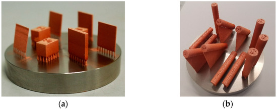 Copper cubes with 10 × 10 × 15 mm³ and vertical walls of 20 × 20 mm2 with different thicknesses of 500 µm, 1 mm, 1.5 mm, and 3 mm were built. Cylinders 8 mm diameter × 43 mm height for static mechanical testing were built in the vertical, horizontal, and 45° building direction (see Figure 1) and then machined to the geometry DIN 50125 B 4 × 20.