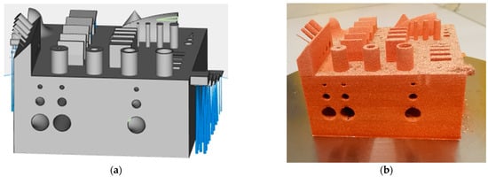 To analyze the dimensional accuracy for certain features such as cylinders, overhangs, and walls, a benchmark geometry developed by the Fraunhofer Institute for Material and Beam Technology IWS within the AGENT-3D program was built and analyzed via 3D scanning using an ATOS Core GOM 135 (GOM GmbH, Braunschweig, Germany) which can be seen in Figure 2. The geometry and previous measurements with 3D scanning and computed tomography (CT) were described in detail by Lopez et al. [24] and Gruber et al. [25].