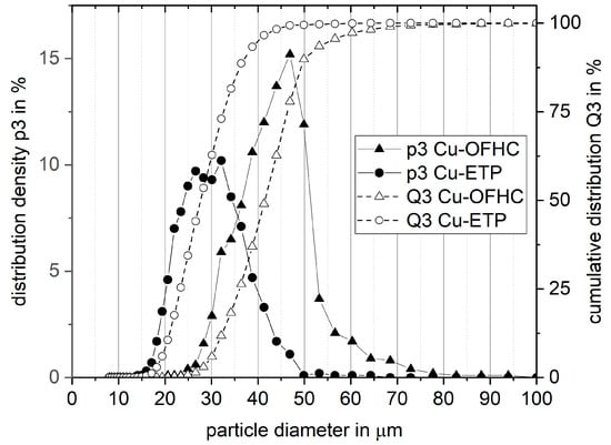 The particle size distribution of both powders differed greatly as can be seen in Figure 4 and Table 1. D10 of Cu-OFHC was almost equal to D90 of Cu-ETP. Cu-ETP showed a bimodal behavior with peaks at 26 µm and 32 µm, whereas Cu-OFHC had a single peak at around 47 µm.