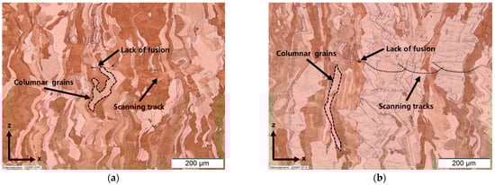 The microstructure in the x–z plane for both powders showed the typical grain growth parallel to the building direction (see Figure 7). Even though the measured porosity was very low, single spots of lack of fusion could be detected in both samples. The scanning tracks were also faintly visible and gave insight on the track width and penetration depth of the laser. The minimum track width was mainly restricted by the used 200 µm laser spot size. Density cubes from both powders showed similar microstructural evolution.