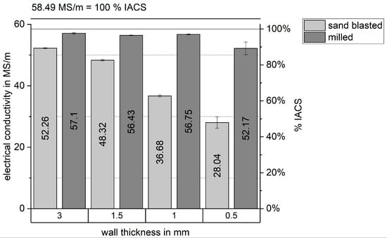 To measure the electrical conductivity, the eddy-current-based device SigmaScope 350 (Helmut Fischer GmbH, Sindelfingen, Germany) was used with an examination frequency of 120 kHz for the microsectioned cubes (x–z plane) and vertical walls (x–y plane) under the two surface conditions sand-blasted and milled. According to ASTM E1004—17 [26], the sample thickness should be at least 2.6 δ where δ is the standard depth of penetration of the induced eddy-currents calculated by Equation (1)